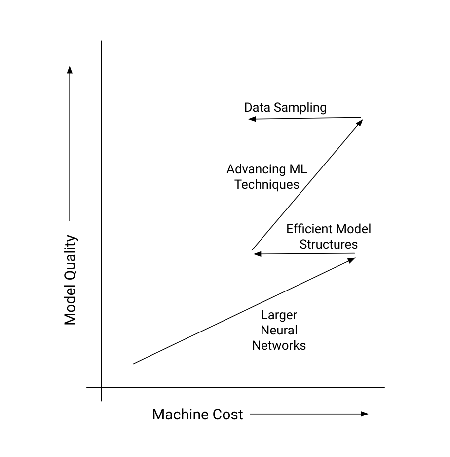 ORSUM @ ACM RecSys, September 23, 2022, Seattle, WA Anil, et al. Figure 1: "Switch-backs" of incremental costly quality-improving techniques and efficiency methods. (Illustration not to any scale.) Figure 2: Weight-sharing based NAS with cost constraints. Through the update at each training step, the sampling rate of better architectures will gradually increase and the sampling dis- tribution will eventually converge to a promising architecture. We select the architecture with maximum likelihood at the end of the training. Constraints specify how to compute the cost of the ac- tivated sub-network, which can typically be done by estimating the number of floating-point operations or running a pre-built hardware-aware neural cost model. The reinforcement learning controller incorporates the provided cost estimate into the reward (e.g., 𝑅 = 𝑅accuracy +𝛾 ·|cost/target −1|, where 𝛾 < 0) [9] in order to force the sampling distribution to converge to a cost-constrained point. In order to search for architectures with lower training cost but neutral accuracy, in our system we set up multiple AutoML tasks with different constraint targets (e.g. 85%/90%/95% of the base- line cost) and selected the one with neutral accuracy and smallest training cost. A recent application of this architecture search to the model reduced time per training step by 16% without reducing accuracy. 3.3 Data Sampling Historical examples of clicks on search ads make up a large dataset that increases substantially every day. The diminishing returns of ever larger datasets dictate that it is not beneficial to retain all the data. The marginal value for improving model quality goes toward zero, and eventually does not justify any extra machine costs for training compute and data storage. Alongside using ML optimiza- tion techniques to improve ML efficiency, we also use data sampling to control training costs. Given that training is a single-pass over data in time-order, there are two ways to reduce the training dataset: 1) restricting the time range of data consumed; and 2) sampling the data within that range. Limiting training data to more recent periods is intuitive. As we extend our date range further back in time, the data becomes less relevant to future problems. Within any range, clicked examples are more infrequent and more important to our learning task; so we sample the non-clicked examples to achieve rough class balance. Since this is primarily for efficiency, exact class balance is unnecessary. A constant sampling rate (a constant class imbalance prior) can be used with a simple single-pass filter. To keep model predictions unbiased, importance weighting is used to up-weight negative examples by the inverse of the sampling rate. Two additional sampling strategies that have proved effective are as follows: •Sampling examples associated with a low logistic loss (typi- cally examples with low estimated CTR and no click). •Sampling examples that are very unlikely to have been seen by the user based on their position on the page. The thresholds for the conditions above are hand-tuned and chosen to maximize data reduction without hurting model accuracy. These strategies are implemented by applying a small, constant sampling rate to all examples meeting any of the conditions above. Pseudo-Random sampling determines whether examples should be kept and re-weighted or simply discarded. This ensures that all training models train on the same data. This scheme may be viewed as a practical version of [28] for large problem instances with expensive evaluation. Simple random sampling allows us to keep model estimates unbiased with simple constant importance re-weighting. It is important to avoid very small sampling rates in this scheme, the consequent large up-weighting can lead to model instability. Re-weighting is particularly important for maintaining calibration, since these sampling strategies are directly correlated to labels. For sampling strategies that involve knowing the loss on an example, calculating that loss would require running inference on the training example, removing most of the performance gains. For this reason, we use a proxy value based on a prediction made by a "teacher model". In this two-pass approach. We first train once over all data to compute losses and associated sampling rates, and then once on the sub-sampled data. The first pass uses the same teacher model for distillation (Section 4.1.2) and is only done