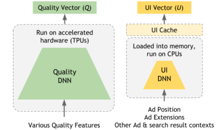ORSUM @ ACM RecSys, September 23, 2022, Seattle, WA Anil, et al. give a general overview of the model and training setup; Section 3 then discusses efficiency concerns and details several successfully deployed techniques. In Section 4, we survey applications of mod- ern ML techniques targeted at improving measures of accuracy and geared explicitly toward very-large-scale models. Section 4.4 summarizes empirical results roughly characterizing the relative impact of these techniques. Deep neural networks (DNNs) provide substantial improvements over previous methods in many applications, including large-scale industry settings. However, non-convex optimization reveals (and exacerbates) a critical problem of prediction: irreproducibility [22, 26, 56–59]. Training the same model twice (identical architec- ture, hyper-parameters, training data) may lead to metrics of the second model being very different from the first. We distinguish between model irreproducibility, strictly related to predictions on fixed data, and system irreproducibility , where a deployed irreproducible model affects important system metrics. Section 5 characterizes the problem and describes improvements to model irreproducibility. An effective click prediction model must be able to general- ize across different UI treatments , including: where an ad is shown on the page and any changes to the formatting of the ad (e.g., bolding specific text or adding an image). Section 6 describes a specific model factorization that improves UI generalization per- formance. Finally, Section 7 details a general-purpose technique for adding bias constraints to the model that has been applied to both improve generalization and system irreproducibility. This paper makes the following contributions: 1) we discuss prac- tical ML considerations from many perspectives including accuracy, efficiency and reproducibility, 2) we detail the real-world applica- tion of techniques that have improved efficiency and accuracy, in some cases describing adaptations specific to online learning, and 3) we describe how models can better generalize across UI treatments through model factorization and bias constraints. 2 MODEL AND TRAINING OVERVIEW A major design choice is how to represent an ad-query pair 𝑥. The semantic information in the language of the query and the ad headlines is the most critical component. Usage of attention layers on top of raw text tokens may generate the most useful language embeddings in current literature [64], but we find better accuracy and efficiency trade-offs by combining variations of fully- connected DNNs with simple feature generation such as bi-grams and n-grams on sub-word units. The short nature of user queries and ad headlines is a contributing factor. Data is highly sparse for these features, with typically only a tiny fraction of non-zero feature values per example. All features are treated as categorical and mapped to sparse embedding tables. Given an input𝑥, we concatenate the embedding values for all features to form a vector 𝑒, the embedding input layer of our DNN. 𝐸 denotes a minibatch of embedding values 𝑒 across several examples. Next, we formally describe a simplified version of the model’s fully-connected neural network architecture. Later sections will introduce variations to this architecture that improve accuracy, efficiency, or reproducibility. We feed𝐸into a fully-connected hid- den layer 𝐻1 = 𝜎(𝐸𝑊1)that performs a linear transformation of 𝐸 using weights 𝑊1 followed by non-linear activation 𝜎. Hidden layers 𝐻𝑖=𝜎(𝐻𝑖−1𝑊𝑖)are stacked, with the output of the 𝑘th layer feeding into an output layer ˆ𝑦=sigmoid(𝐻𝑘𝑊𝑘+1)that generates the model’s prediction corresponding to a click estimate ˆ𝑦. Model weights are optimized following min𝑊 Í 𝑖 L(𝑦𝑖,ˆ𝑦𝑖). We found Re- LUs to be a good choice for the activation function; Section 5 de- scribes improvements using smoothed activation functions. The model is trained through supervised learning with the logistic loss of the observed click label 𝑦 with respect to ˆ𝑦. Sections 4 and 7 describe additional losses that have improved our model. Train- ing uses synchronous minibatch SGD on Tensor Processing Units (TPUs) [37]: at each training step 𝑡, compute gradients 𝐺𝑡 of the loss on a batch of examples (ranging up to millions of examples), and weights are optimized with an adaptive optimizer. We find that AdaGrad [25, 46] works well for optimizing both embedding weights and dense network weights. Moreover, In Section 4.2 dis- cusses accuracy improvements from deploying a second-order optimizer: Distributed Shampoo [5] for training dense network weights, which to our knowledge, is the first known large-scale deployment in a production scale neural network training system. 2.1 Online Optimization Given the non-stationarity of data in ads optimization, we find that online learning methods perform best in practice [45]. Models train using a single sequential pass over logged examples in chronological order. Each model continues to process new query-ad examples as data arrives [62]. For evaluation, we use models’ predictions on each example from before the example is trained on (i.e., progressive validation) [12]. This setup has a number of practical advantages. Since all metrics are computed before an example is trained on, we have an immediate measure of generalization that reflects our deployment setup. Because we do not need to maintain a holdout validation set, we can effectively use all data for training, leading to higher confidence measurements. This setup allows the entire learning platform to be implemented as a single-pass streaming algorithm, facilitating the use of large datasets. 3 ML EFFICIENCY Our CTR prediction system provides predictions for all ads shown to users, scoring a large set of eligible ads for billions of queries per day and re
